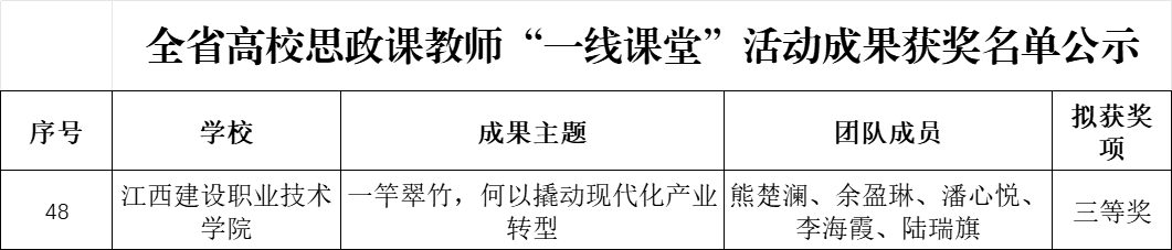 近日,江西省教育厅公布全省高校思政课教师“一线课堂”优秀成果评选结果,本次评选共收到全省各高校推荐作品229项,经专家评审共评出73项获奖作品,我校马克思主义学院熊楚澜教师团队报送的作品《一杆翠竹,何以撬动现代化产业转型》荣获三等奖,实现了学校在该项目上的首次突破。